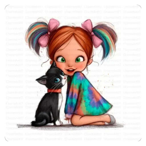 Menina com pigtails coloridos e vestido tie-dye beija um gato preto com colar laranja.