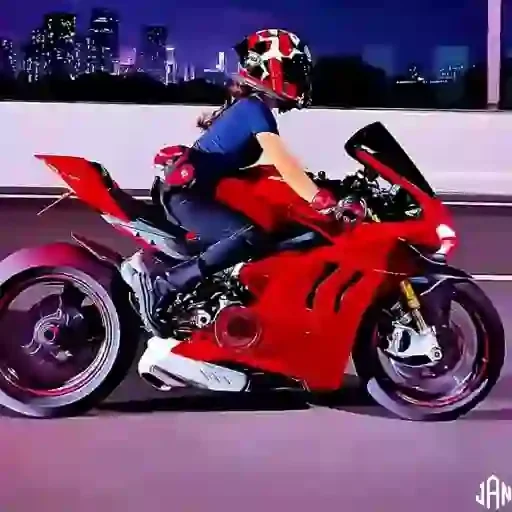 Mulher de capacete vermelho e azul pilota uma moto vermelha em uma estrada com uma cidade ao fundo.