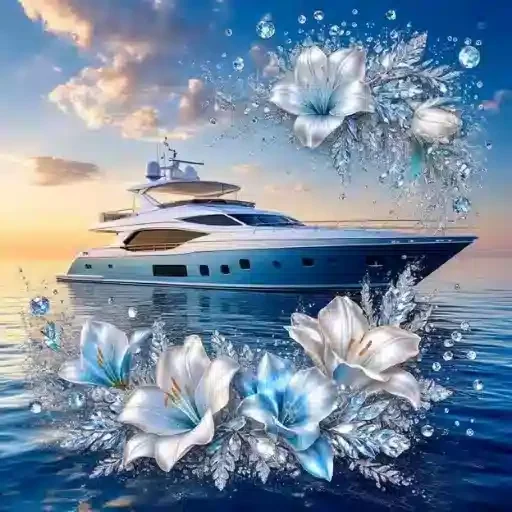 Um iate de luxo branco e azul flutua serenamente na água, decorado com flores brancas e azuis que parecem emergir do mar. O céu ao fundo exibe tons de azul, laranja e amarelo ao pôr do sol.