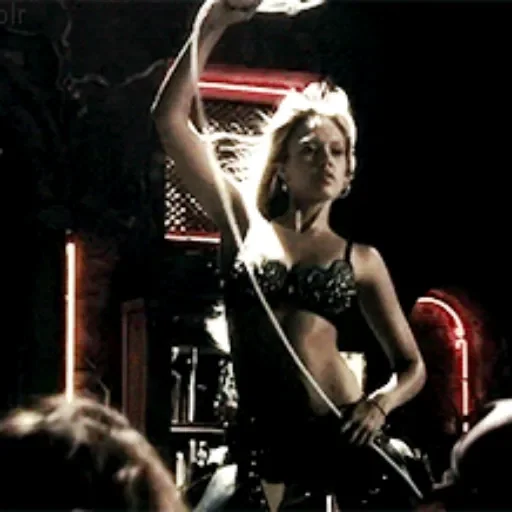 Mulher loira com um look sensual, vestida com um sutiã preto, com um braço levantado e luzes de neon ao fundo.