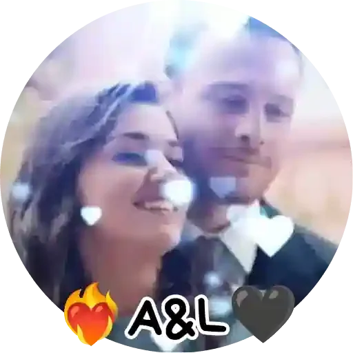 Um casal sorrindo com corações e o texto 'A&L' em primeiro plano. A mulher tem cabelo castanho e o homem está ao lado com um fundo desfocado.