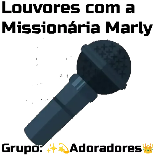 Um microfone preto com o texto 'Louvores com a Missionária Marly' e 'Grupo: Adoradores' em preto, com emojis de estrela e coroa dourada.