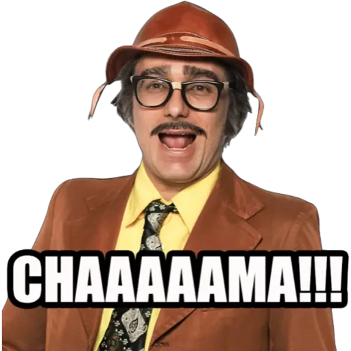 Um homem com um chapéu de aba larga, óculos e um terno marrom, com a boca aberta e expressão surpresa, e o texto "CHAAAAAMA!!!" sobreposto.