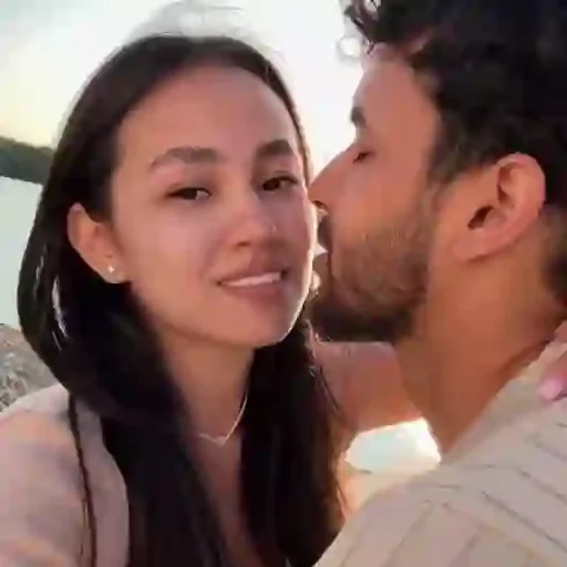 Um casal, com a mulher sorrindo e o homem beijando seu rosto, em um cenário ao ar livre durante o pôr do sol.