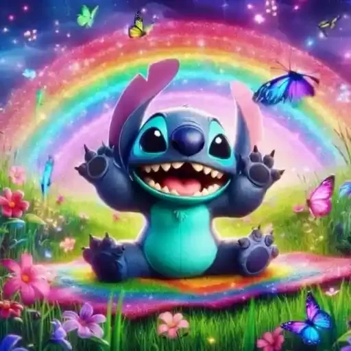 Stitch sorri com as mãos levantadas em um cenário colorido com arco-íris, borboletas e flores.