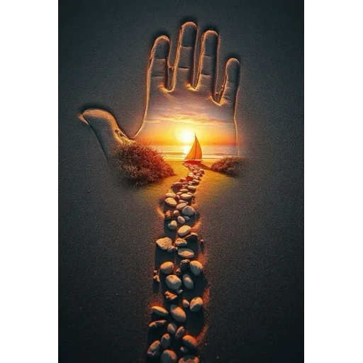 Uma mão com os dedos abertos emite uma luz intensa enquanto pequenos pássaros coloridos saem da palma, voando em direção ao pôr do sol ao fundo.