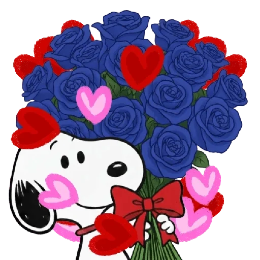 Snoopy com um buquê de rosas azuis e corações vermelhos e rosa, com um laço vermelho.