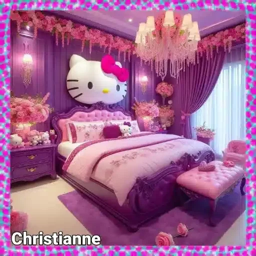 Quarto rosa com cama e decoração da Hello Kitty, cortinas e parede rosa, com o nome 'Christianne' no canto.