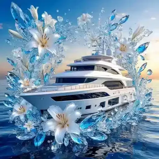 Um iate branco luxuoso em alto mar, cercado por flores brancas e cristais azuis, com o sol se pondo ao fundo.