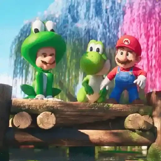 Três personagens de um jogo: Yoshi, um lagarto verde e Mario, usando um chapéu vermelho com um 'M' branco, óculos brancos, macacão azul e camisa vermelha, em pé atrás de um tronco.