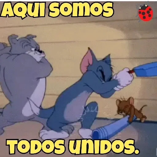 Tom e Jerry estão unidos, com Tom olhando para Jerry que segura um objeto azul. O texto 'AQUI SOMOS TODOS UNIDOS' aparece em destaque.