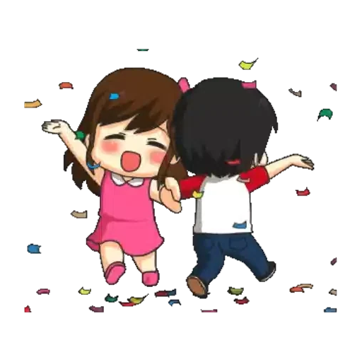Um casal de anime, uma menina de vestido rosa e um menino de camisa branca, pulando com confetes coloridos ao redor.