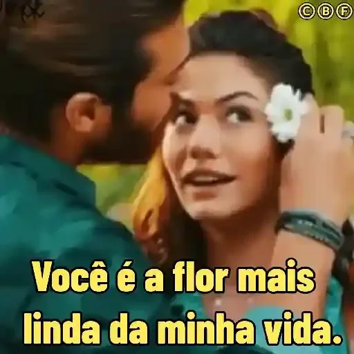 Um homem beijando a testa de uma mulher com uma flor no cabelo, com o texto 'Você é a flor mais linda da minha vida' em amarelo.