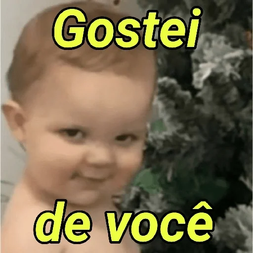Um bebê com expressão facial neutra e cabelos castanhos curtos, com o texto "Gostei de você" sobreposto em amarelo.