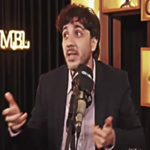 Homem de terno e gravata, com as mãos abertas e expressão surpresa, falando em um microfone com o logotipo "MBL" ao fundo.