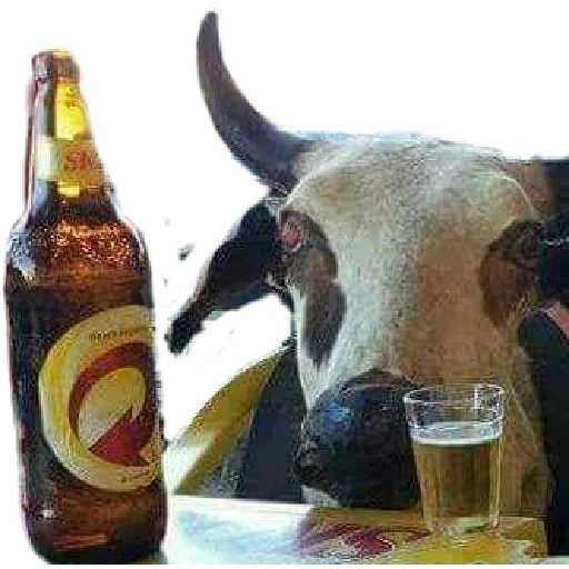 Uma vaca com chifres sentada à mesa bebendo cerveja, ao lado de uma garrafa e um copo de cerveja.