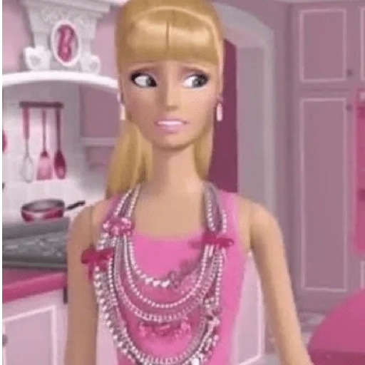 Boneca Barbie loira com vestido rosa e muitas pulseiras de joias, em um ambiente rosa.