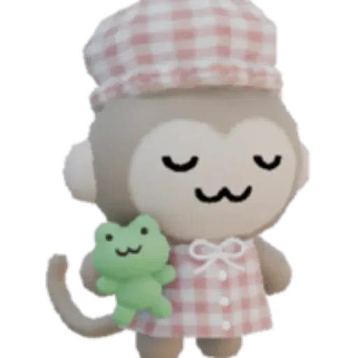 Macaco fofinho de pijama xadrez rosa e branco com um sapo verde, usando um chapéu xadrez. O macaco tem um sorriso no rosto e os olhos fechados.