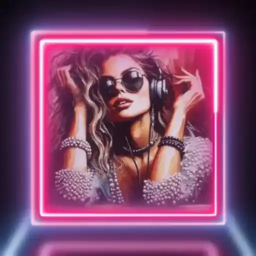 Uma mulher com cabelos ondulados e óculos de sol está ouvindo música com fones de ouvido, dentro de um quadro com contorno de neon rosa e roxo.