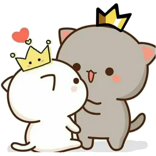 Dois gatinhos fofos com coroas douradas, um branco e um cinza, com um coração vermelho saindo da cabeça do gato branco.