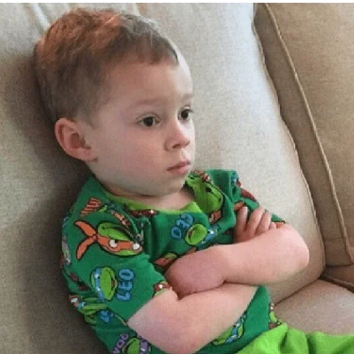 Menino pequeno deitado no sofá com os braços cruzados, vestindo uma camisa verde com desenhos de tartarugas.