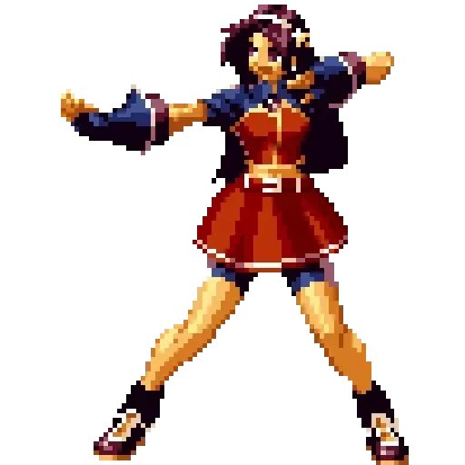 Uma mulher de cabelo roxo em uma pose de luta, vestindo uma saia vermelha e um top azul com detalhes em branco.