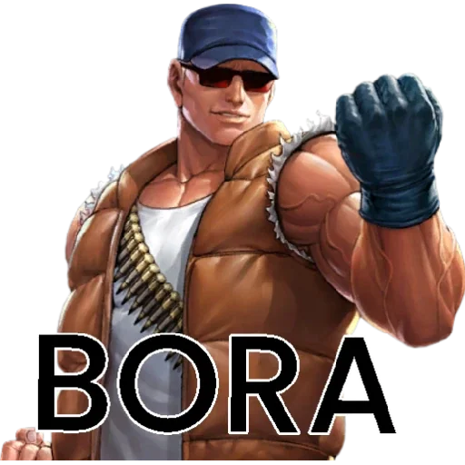Um personagem de anime musculoso com óculos escuros e um boné azul, vestindo um colete marrom e uma luva preta, com a palavra 'BORA' em letras grandes na frente.