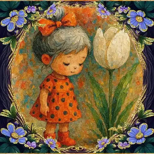 Menina com cabelo grisalho e um laço laranja olhando para uma tulipa branca, vestida com um vestido laranja com manchas pretas, em um cenário floral.