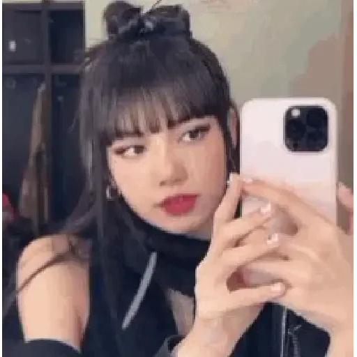Uma jovem mulher com franja e cabelo escuro fazendo uma selfie com um celular rosa.