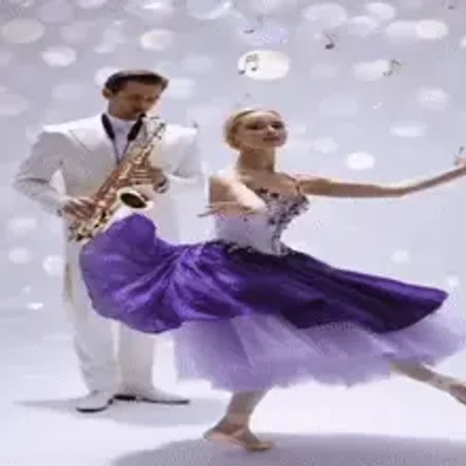 Um casal dançando, com um homem de terno branco tocando saxofone e uma mulher de vestido roxo e branco fazendo uma pose de dança.