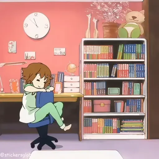 Menina sentada em uma cadeira de escritório com um livro, em frente a uma estante cheia de livros e uma mesa com objetos. Ela tem cabelo castanho e veste uma camisa branca e calça verde.