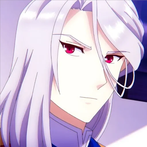 Rosto de anime com cabelo branco longo e olhos vermelhos, expressão séria.