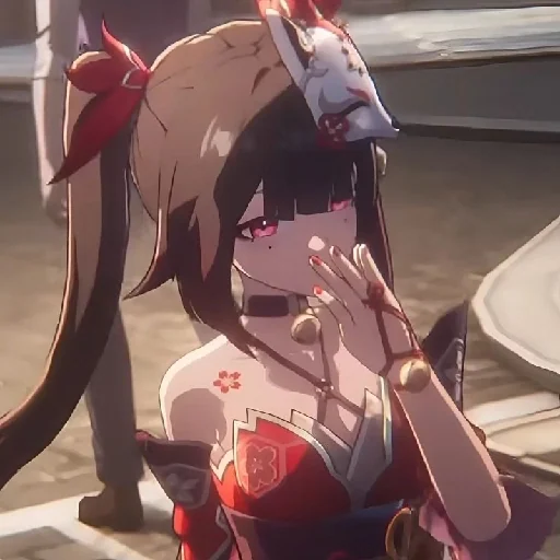 Uma garota de anime com cabelos castanhos e olhos vermelhos, vestindo um traje vermelho, com uma máscara de lobo na cabeça e uma expressão tímida, cobrindo a boca com a mão.