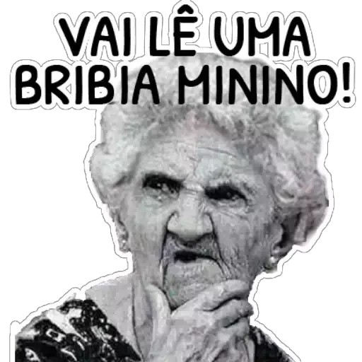 Uma mulher idosa com expressão séria e o dedo indicador na boca, com o texto 'VAI LÊ UMA BRIBIA MININO!' em letras pretas acima dela.