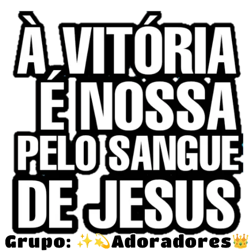 Uma figurinha com texto em branco e preto que diz 'À VITÓRIA É NOSSA PELO SANGUE DE JESUS' com o subtítulo 'Grupo: Adoradores'.