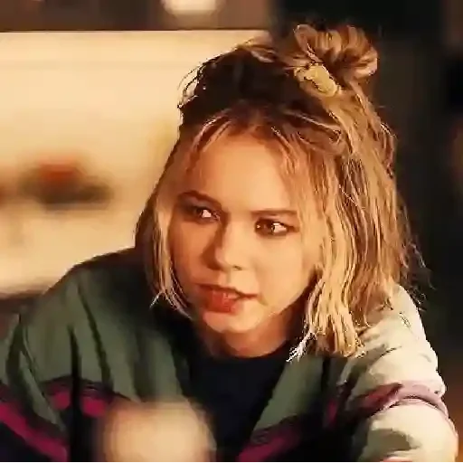 Mulher loira com expressão surpresa ou confusa, cabelo preso em um coque despretensioso, vestindo uma jaqueta verde com detalhes em rosa.