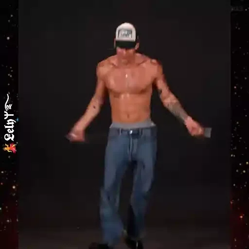Homem sem camisa, com boné branco e jeans, fazendo um gesto com os braços. Fundo preto.