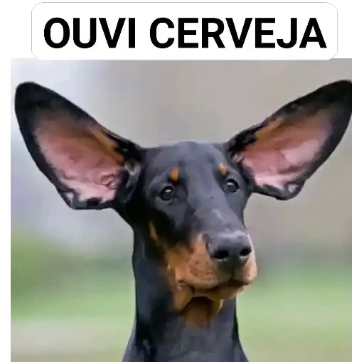 Um cão Doberman com orelhas grandes e expressão curiosa, com o texto 'OVI CERVEJA' em cima.