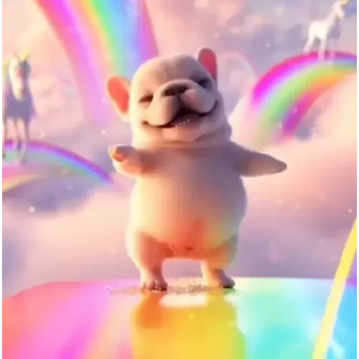 Um hamster dançando em uma superfície colorida com arco-íris ao fundo.