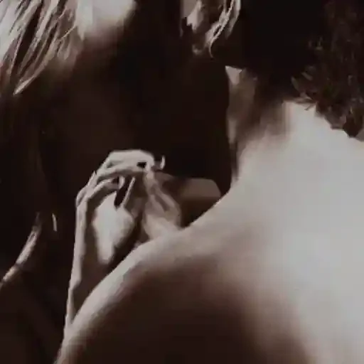 Dois corpos nus se beijando em preto e branco, com um fundo escuro.
