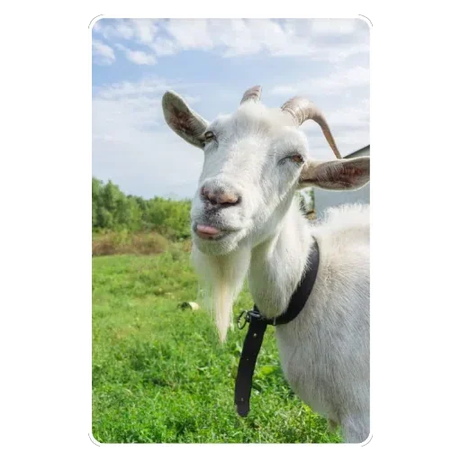 Uma cabra branca com chifres castanhos e uma faixa preta no pescoço, em um campo verde com céu azul ao fundo.