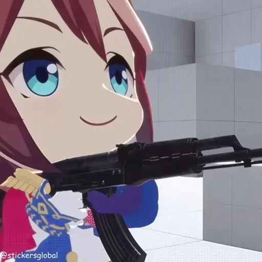 Garota de anime com cabelos castanhos e olhos azuis sorrindo e apontando uma metralhadora preta. Ela veste uma roupa azul e rosa.