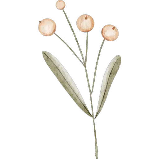 Ilustração de um ramo com folhas verdes e frutos redondos bege.