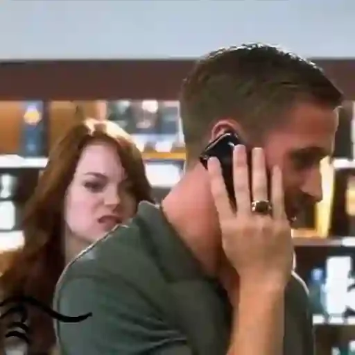 Um homem falando ao telefone com uma expressão séria, enquanto uma mulher com uma expressão de desaprovação aparece ao fundo.