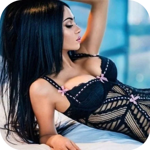 Mulher deitada de lado, com cabelo preto longo, vestindo lingerie preta com detalhes em renda e flores rosa. Fundo azul desfocado.