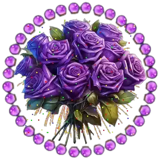 Um buquê de rosas roxas com folhas verdes, cercado por uma borda de círculos roxos. O buquê é decorado com confetes coloridos.