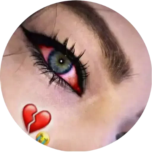 Olho de uma mulher com maquiagem colorida e delineado, com um coração partido em vermelho no canto inferior esquerdo.