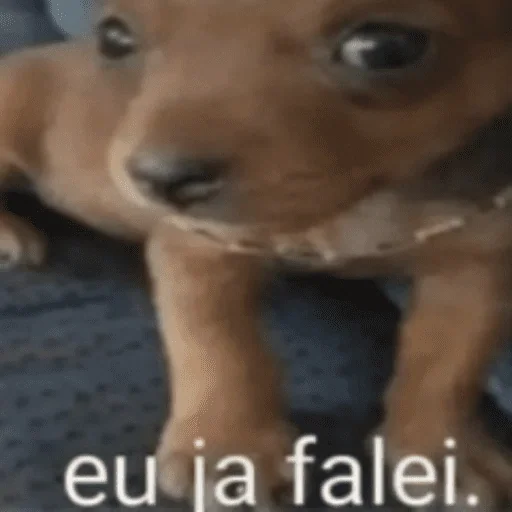 Um cachorrinho marrom com expressão séria e o texto 'eu já falei' em branco na parte inferior.
