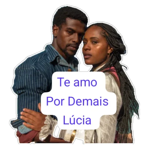 Um casal de pele escura se abraçando, com um texto em uma bolha que diz 'Te amo Por Demais Lúcia'.