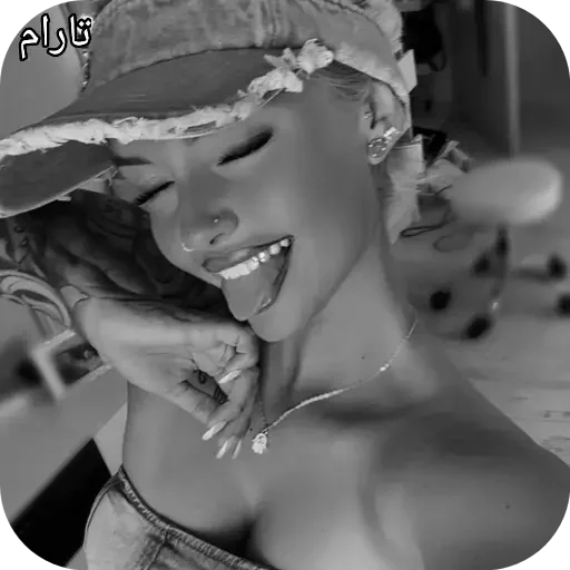 Uma mulher com um chapéu, fazendo careta e com a língua para fora, em preto e branco. Há um texto 'Pff' no canto superior esquerdo.